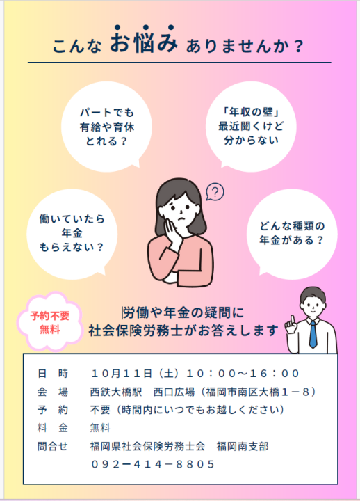 Home ★お知らせ(イベント等) 【10/11(土)】社会保険労務士無料相談会&社労士イベント@西鉄大橋駅西口